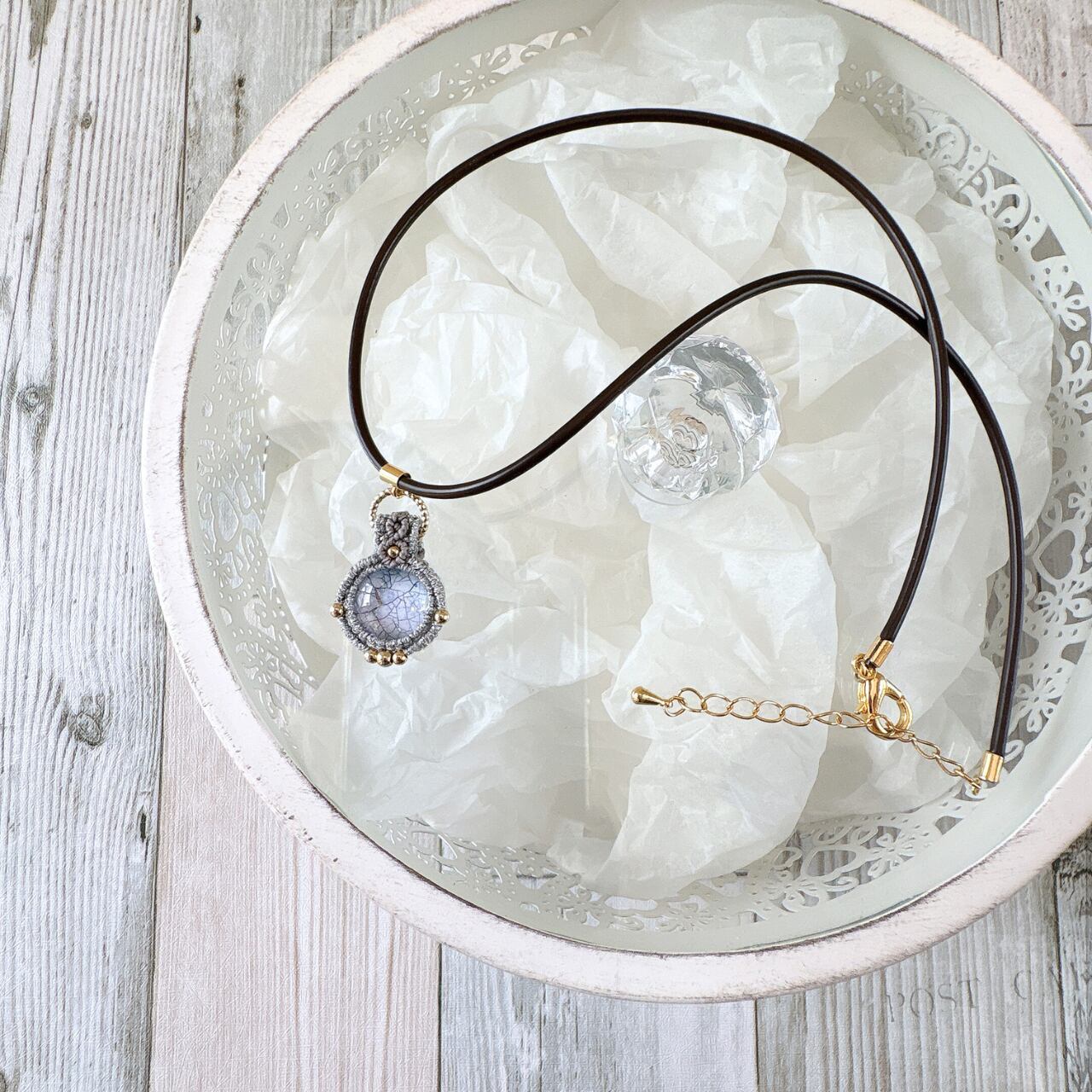 卵の殻・ワックスコード・レース糸・ガラスカボション・メタルビーズ・革ひも(濃いこげ茶)・アジャスター