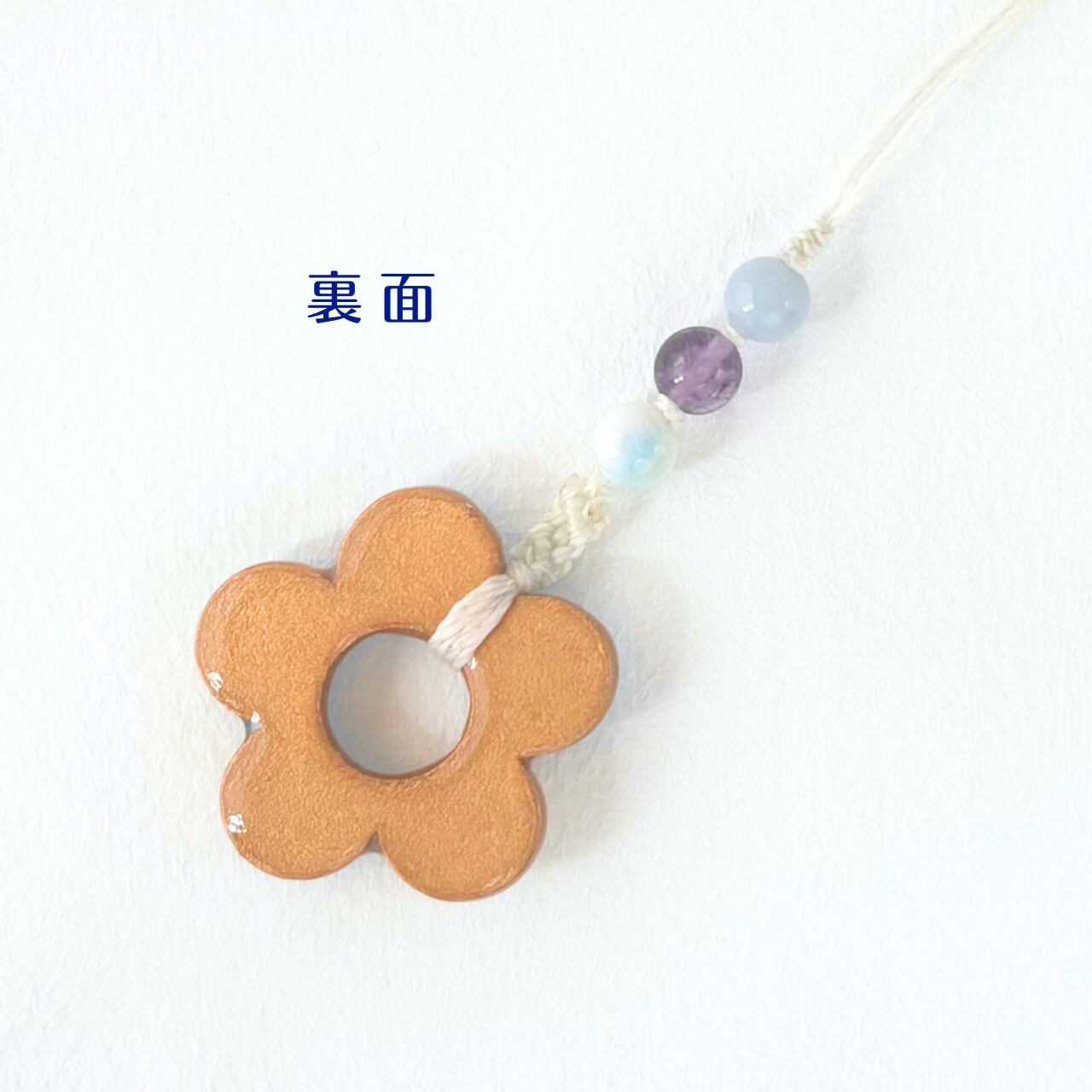 このストラップには、エンジェライトとアメジストの天然石が使用されており、