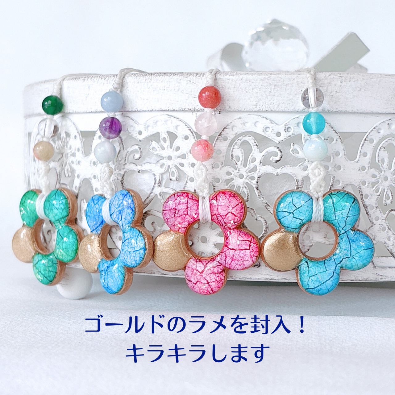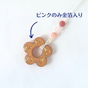 このストラップは、天然石のチューライトとローズクォーツを使用しており、