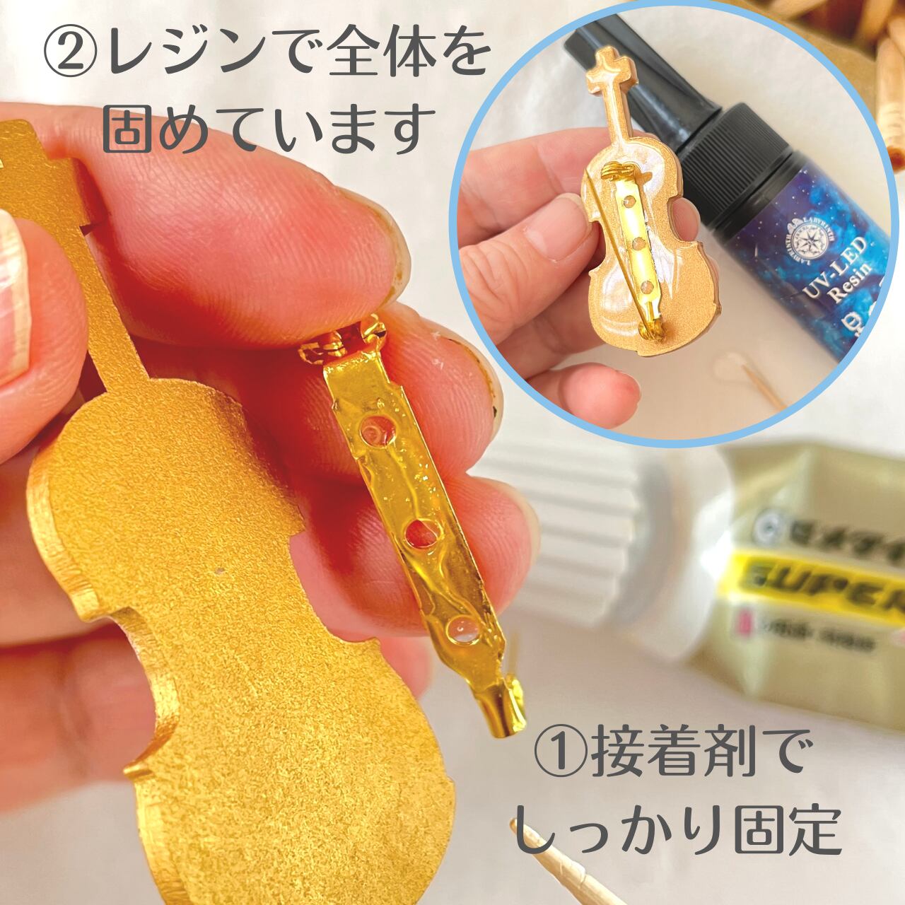 卵の殻・木製のベース・レジン・ラメ・ブローチピン・真鍮粉