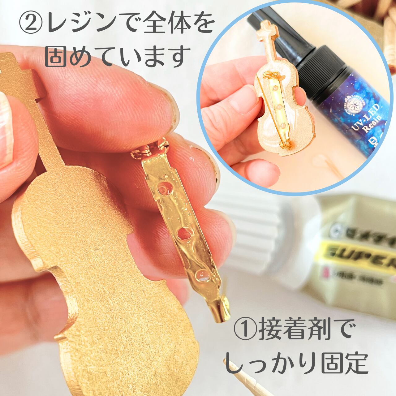 卵の殻・木製のベース・レジン・ブローチピン・真鍮粉・飾り